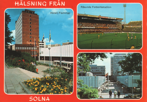 Vykort från Solna, mitten av 1980-talet. Jag var här då också. I en knapp dag. Vill minnas att det var sensommar, augusti. Reste upp från min dåvarande halländska hemstad Kungsbacka för att headbanga på min första hårdrockskonsert. Monsters of Rock, Råsunda. Fräcka grejer. Det var Mötley Crüe, Van Halen och AC/DC. Eddie van Halen gjorde ett gitarrsolo som klockade på femton minuter. Ungefär lika roligt som att betrakta färsk färg torka på en nymålad vägg. Sedan dess har jag varit allergisk mot instrumentalsolon under livekonserter. Värst i kategorin är när trummisen bankar loss mol allena. Liksom, varför? Men skitsamma, nu är jag tillbaka. I Solna. Vädret är fint och i eftermiddags skymtade jag Sveriges bästa tennisreporter Jonas Arnesen i köpcentrumet. Bara en sån sak. Hej!