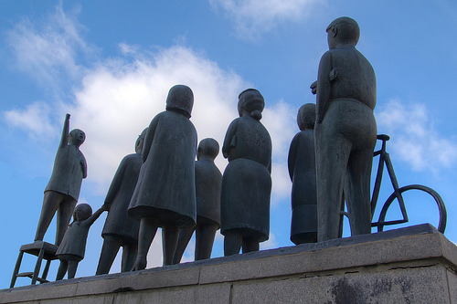 Utanför stadshuset i Borås står denna skulpturgrupp, Folktalaren, skapad av Sven Lundqvist 1957. När jag jobbade på Borås Tidning, det var några år sedan, hade jag en idé om att ”intervjua” varje medverkande figur som stått där i ett halvt sekel och lyssnat tålmodigt.