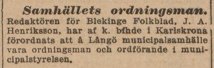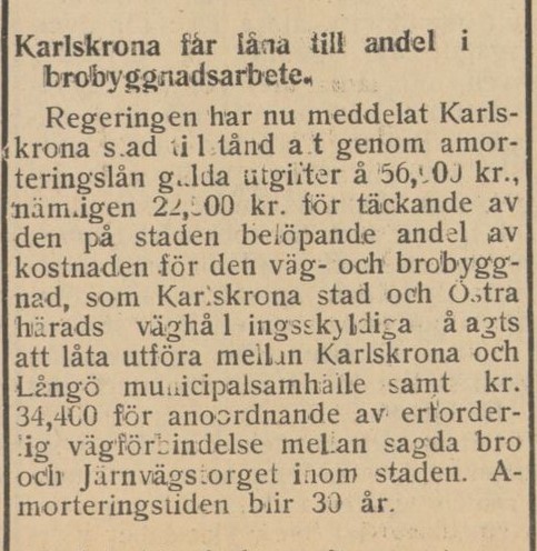 Vi kan bland annat tacka borgmästare Henricsson för tillkomsten av en ordentlig förbindelse till fastlandet, nämligen Södra Långöbron (eller Gamla Långöbron som den företrädesvis kallas numera). Det krävdes många års påtryckningar – med början redan 1913! – men till slut blev saken biff. Ur Blekinge Läns Tidning tisdagen den 15 januari 1929. Bron stod klar samma år.