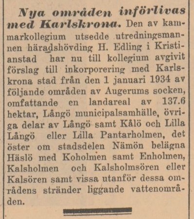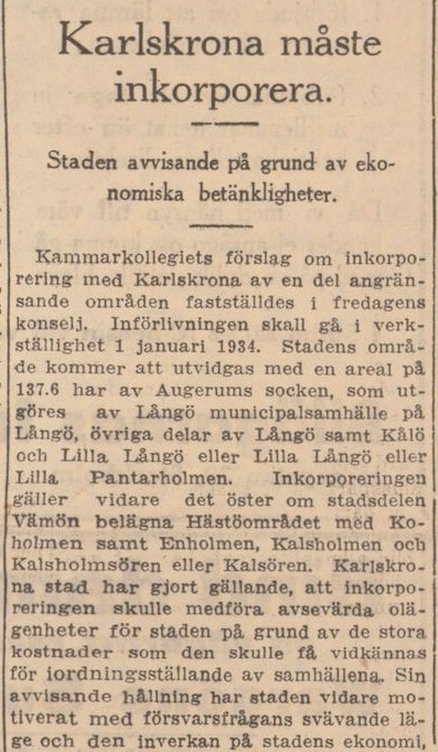 Men Långös självstyre sjöng snart på sista versen. Staten, genom kammarkollegium, beslutade för en sammanslagning med Karlskrona. Ur Svenska Dagbladet onsdagen den 22 juni 1932.