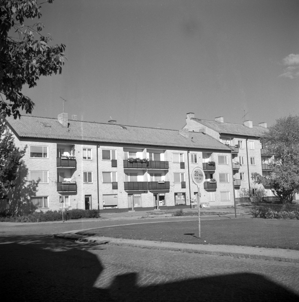 Här står vi vid korsningen Muraregatan-Ingenjörsgatan och skådar det färdiga resultatet av Valter Liljeströms projekt. Sannolikt befinner vi oss nu i det sena 60-talet. I affärslokalerna på kåken framför oss skymtar från höger en tobakshandel, en frisör, en damsalong och vad som ser ut som en liten ICA-butik av loggan på fönstret att döma.