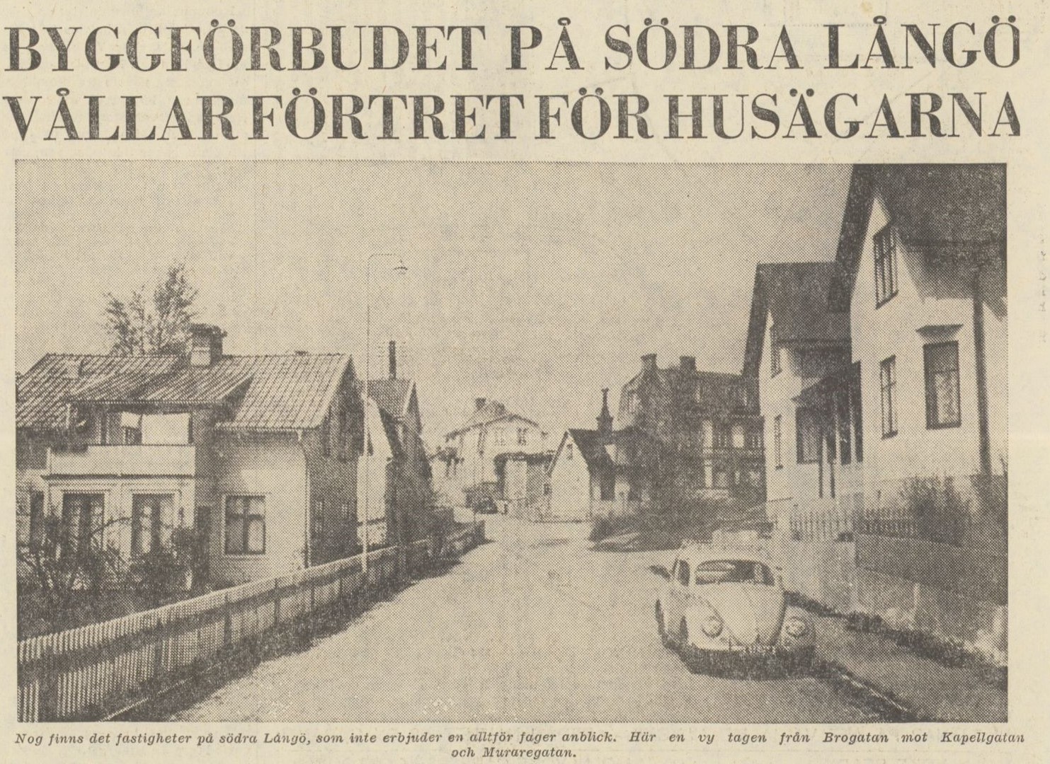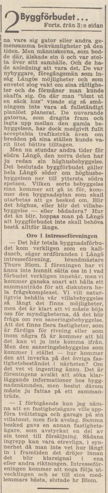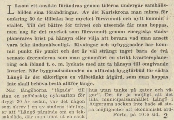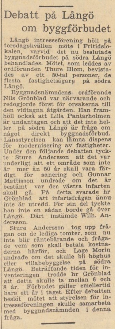 Byggförbudet och hotet om uppförandet av en stor infartsled till Karlskrona över Långö var självfallet heta frågor när intresseföreningen sammanträdde. Ur BLT den 1 juni 1963.