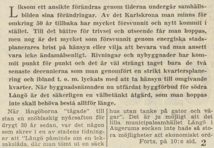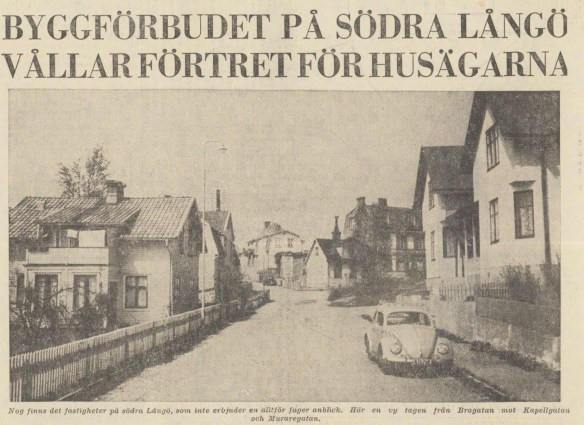 Långös förlorade självstyre hade sitt pris. Man kan nog lugnt förmoda att salig ”borgmästare” J A Henricsson, som själv byggde två hus på Långö, inte skulle varit helt nöjd om han tvingats uppleva detta. Ur BLT den 16 maj 1963.