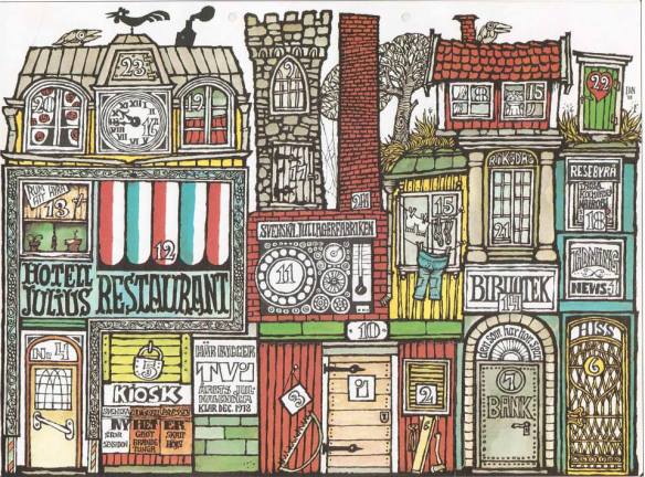 Det svängiga manuset skrevs av krogshow-rävarna Åke Cato och Björn Barlach. För musiken svarade jazzkatten Lasse Bagge, motor i legendariska Gals & Pals – det svenska 60-talets Manhattan Transfer. Handlingen utspelades bakom och framför luckorna i julkalendern. Bokstavligen alltså. Scenografin i TV-studion var en jättelik, utseendemässigt identisk version av pappkalendern som fanns att köpa i butikerna och hade ritats av ingen mindre än mästertecknaren EWK!
