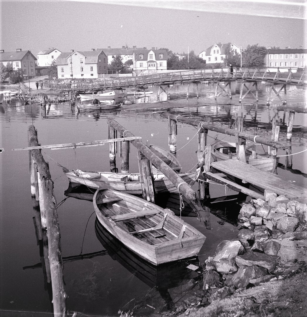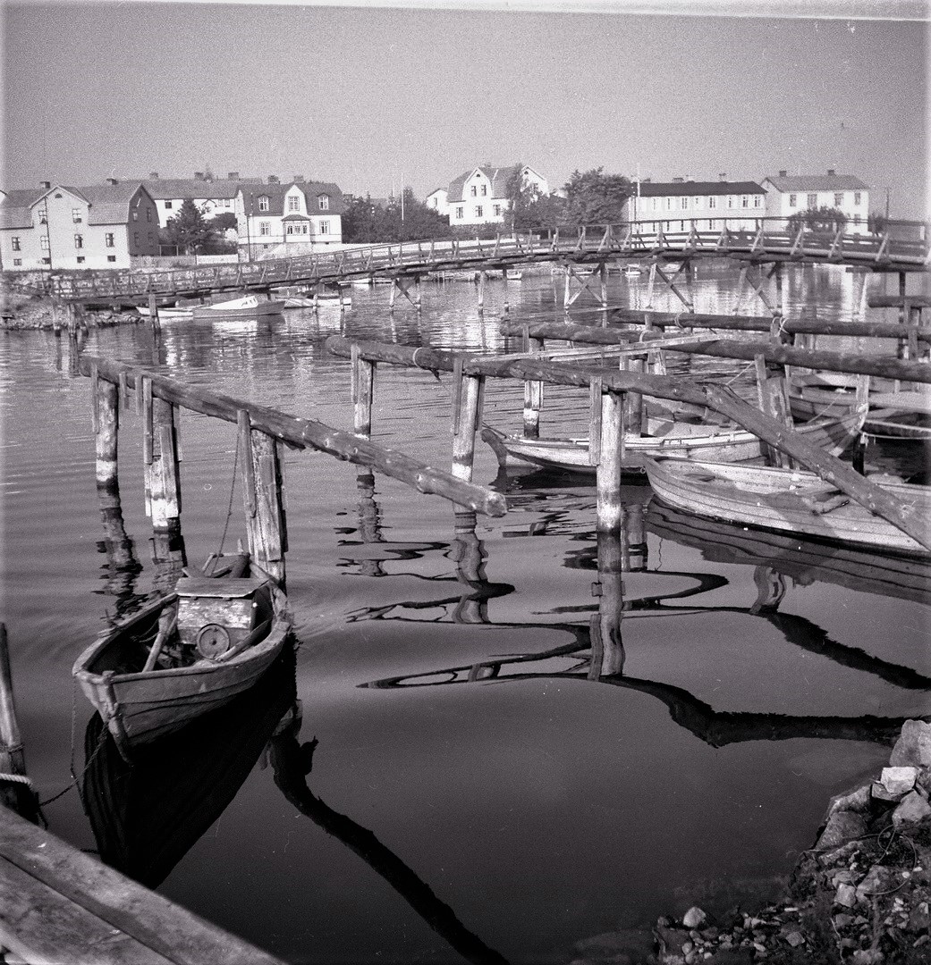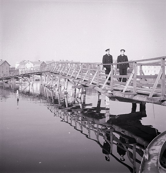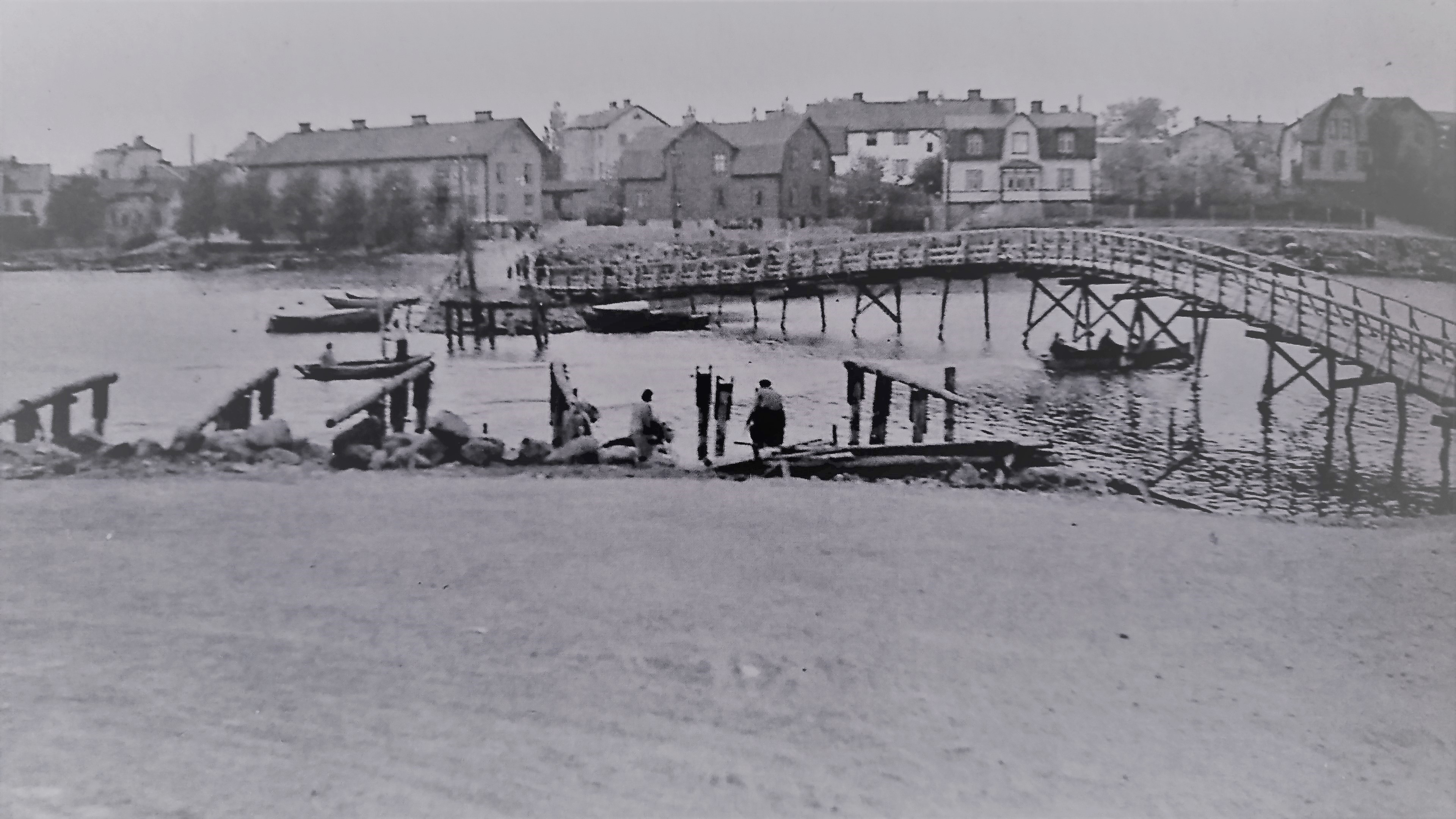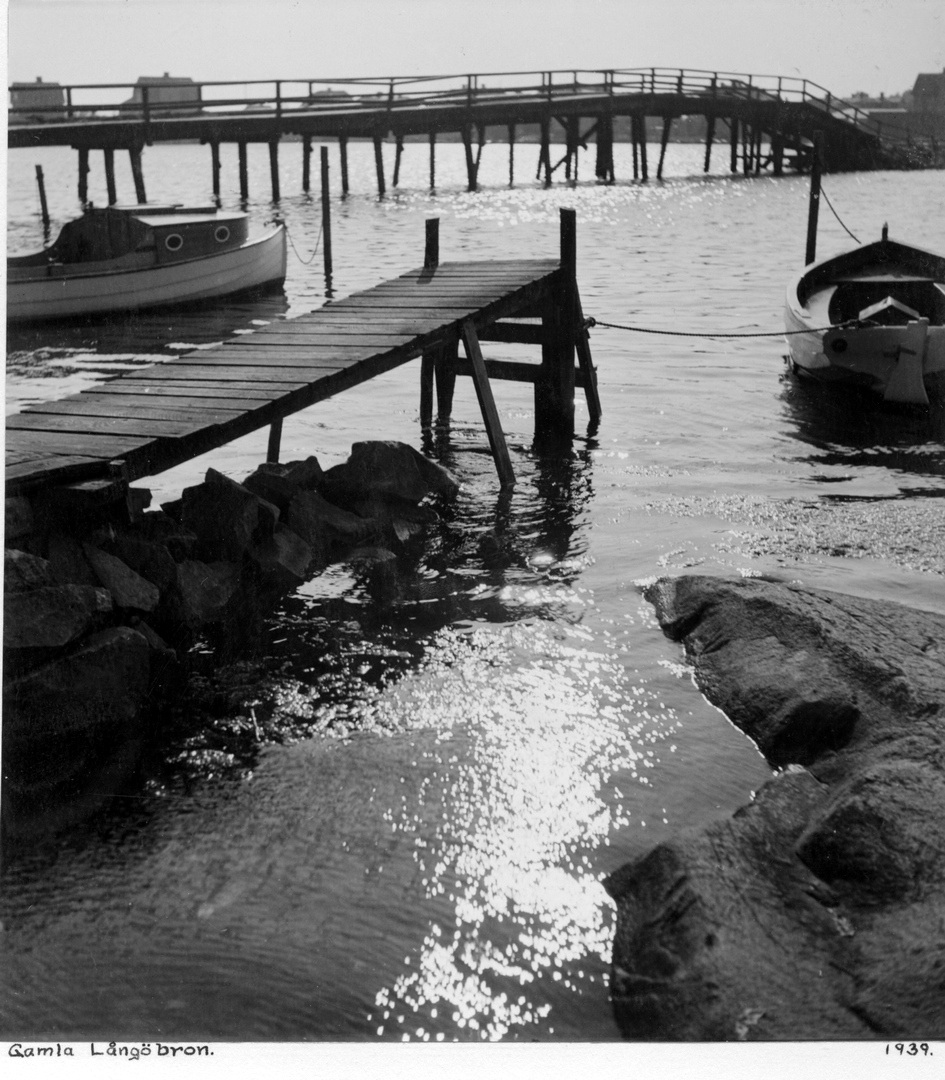 Den ursprungliga Långbron från 1905. Långöbron på den översta bilden revs 1940. På denna bild ser vi kvarvarande spantdelar sticka ut från Pantarholmskajen Som ersättning har en provisorisk pålad gångbro uppförts.Här är två flottisters vandring över gångbron förevigad till eftervärldens beundran. Vägen framför bron på Långösidan intill barnrikehuset ”Ladan” kallades Brogatan. Namnet försvann 1962 när gatan upphörde och blev kvartersmark (från 1958 benämnt Sälgen, kvarteret öster om dåvarande Brogatan kallades tidigare för Tallen innan kvarterssammanslagningen skedde, som gjorde Brogatan till ett bleknat minne blott). Detta provisorium skattade åt förgängelsen i samband med att den nuvarande moderna bilbron i betong byggdes en liten längre bit bort vid Pantarholmskajen 1953 (invigd den 15 oktober det året). Det var då höghusområdet på Norra Långö tillkom, vilket krävde effektivare trafiklösningar.