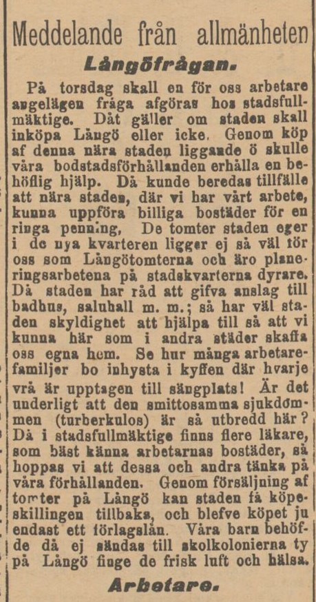 Långö sedd från Pantarholmen runt 1910 (klicka på bilden för större upplösning). ”Ön var då föga bebyggd, något hundratal invånare, och känd som vara den plats, där staden höll före att den hade rätt att placera bråkigt och otrevligt folk. De sämre av stadens innevånare hänvisades dit när husrum ej stod att uppbringa i staden”, skriver vår käre borgmästare J A Henricsson som flyttade hit 1906.
