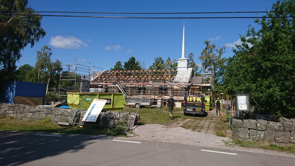 Tjurkö kyrka, uppförd 1876, har tyvärr länge tillåtits förfalla och de senaste åren tvingats hållas stängd. En kulturhistorisk skandal. Men i somras kom äntligen renoveringen igång. ”Verkligen i sista stund”, som en av byggjobbarna sa när jag hade vägarna förbi idag. Återinvigning är planerad till nästa sommar.