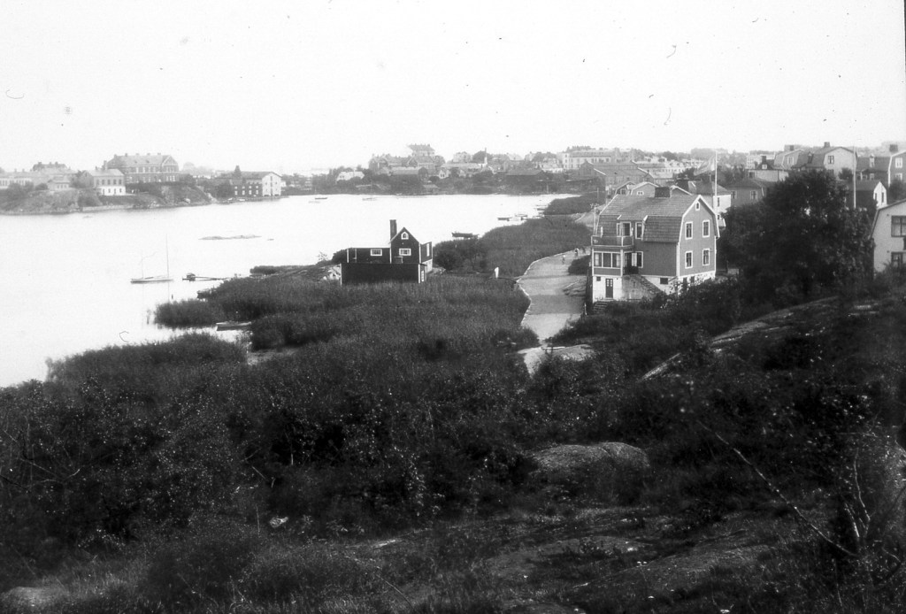 Känner ni igen den här vyn, Långövänner? Kanske inte helt lätt vid första anblicken. Kortet är taget på 1920-talet. Det är Rökans berg i förgrunden, samt Abborrberget och början av Vikingagatan på andra sidan den lilla viken, vars strandlinje blivit något utfylld sedan dess.