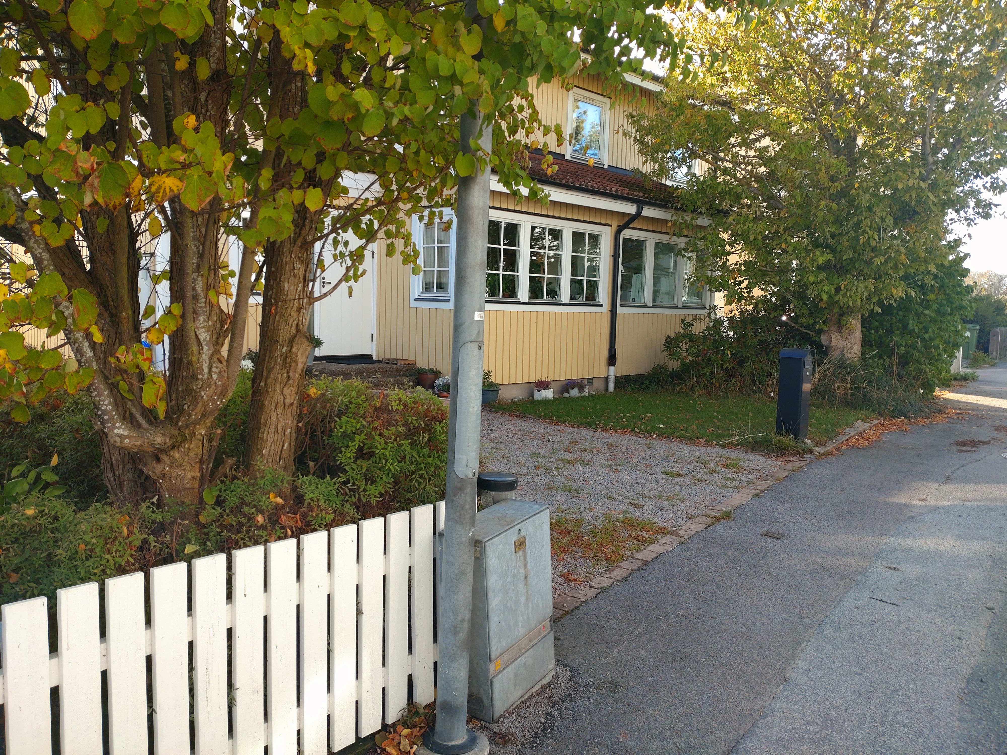 Detta fotografi är taget 1971 och det stora huset i förgrunden har adressen Kapellgatan 9. Byggnaden, som kallades också för Kapellet, var något av ett landmärke på Långö eftersom det lågt högt och syntes vida omkring. Så här skriver Leif Karlsson om Kapellgatan: ”När gatunamnet fastställdes 1913 i Långö Municipalstämma föreslogs de alternativa namnförslagen Karlskronagatan och Stampgatan. Med stor majoritet röstades emellertid för Kapellgatan. Som bakgrund angavs att gatan ledde till f d kapellet vid dess ena ände.”Detta fotografi är taget på samma plats idag. Kapellet är borta. Istället ligger här numera ett kedjehus som uppfördes 1982. Men skymd bakom trädet står fortfarande grannfastigheten på Kapellgatan 11 kvar, precis som den gjorde 1971 – jag lovar!