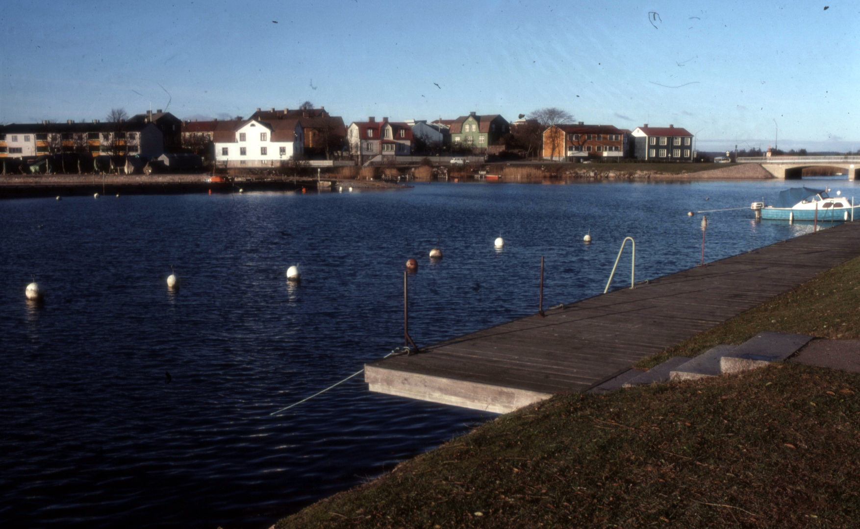 Södra Långö sedd från Pantarholmen 1976. Överst till vänster i bild skådar vi huset som ersatte den för seniora Långöbor smått legendariska ”Ladan” på Östra Strandgatan. Sliprälsen som går ner i vattnet vid Pantarholmens båtklubb är anlagd på stället för den ursprungliga Långöbrons landfäste.
