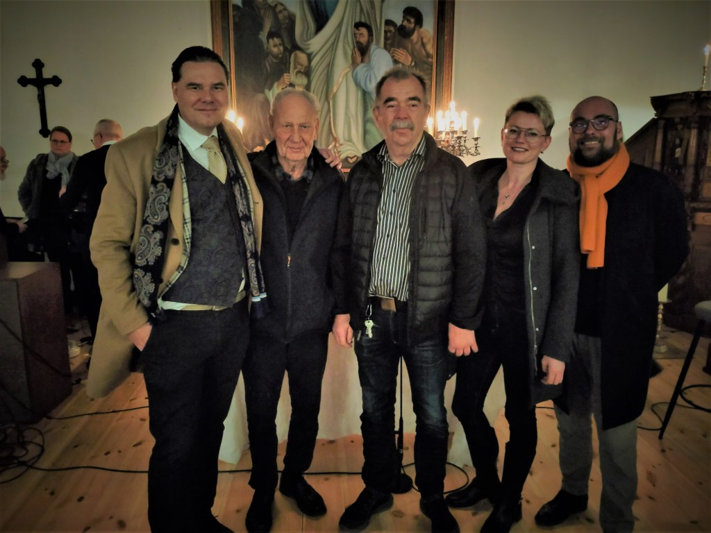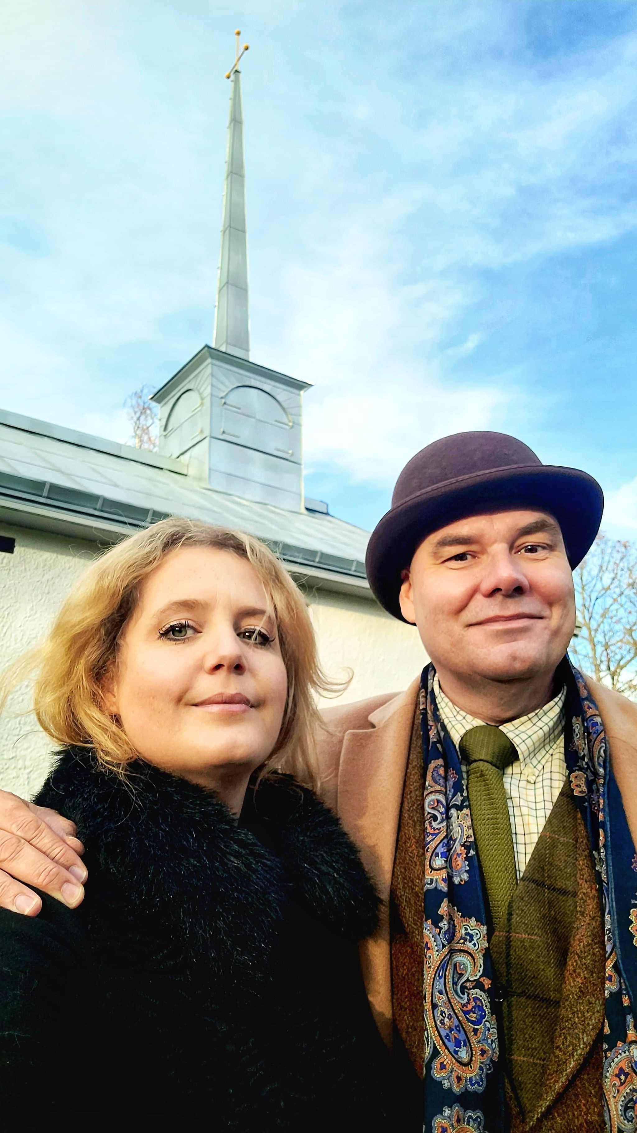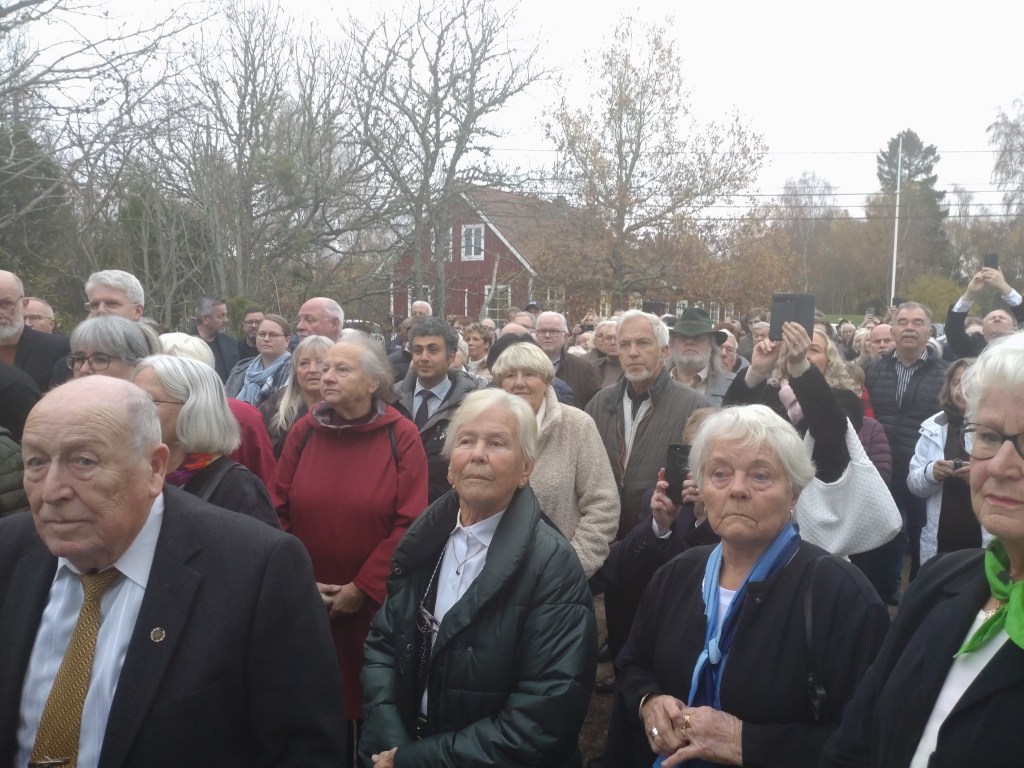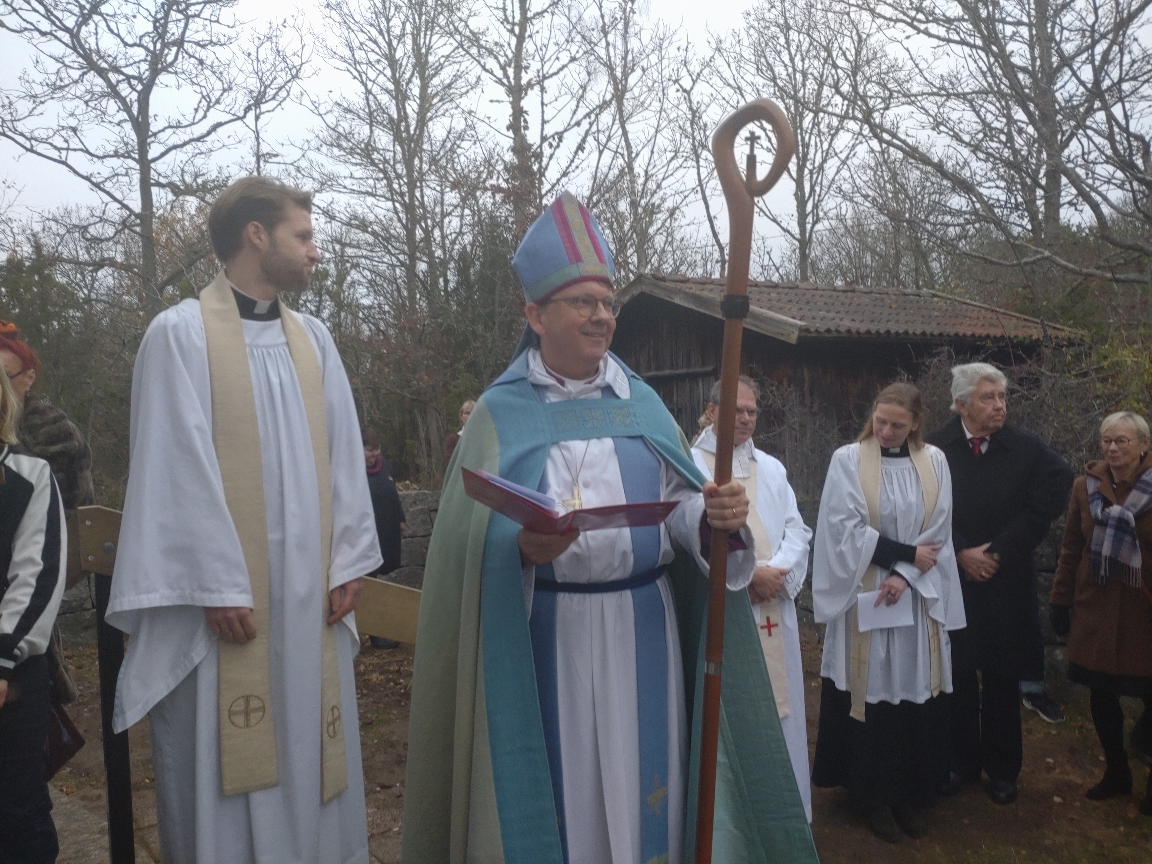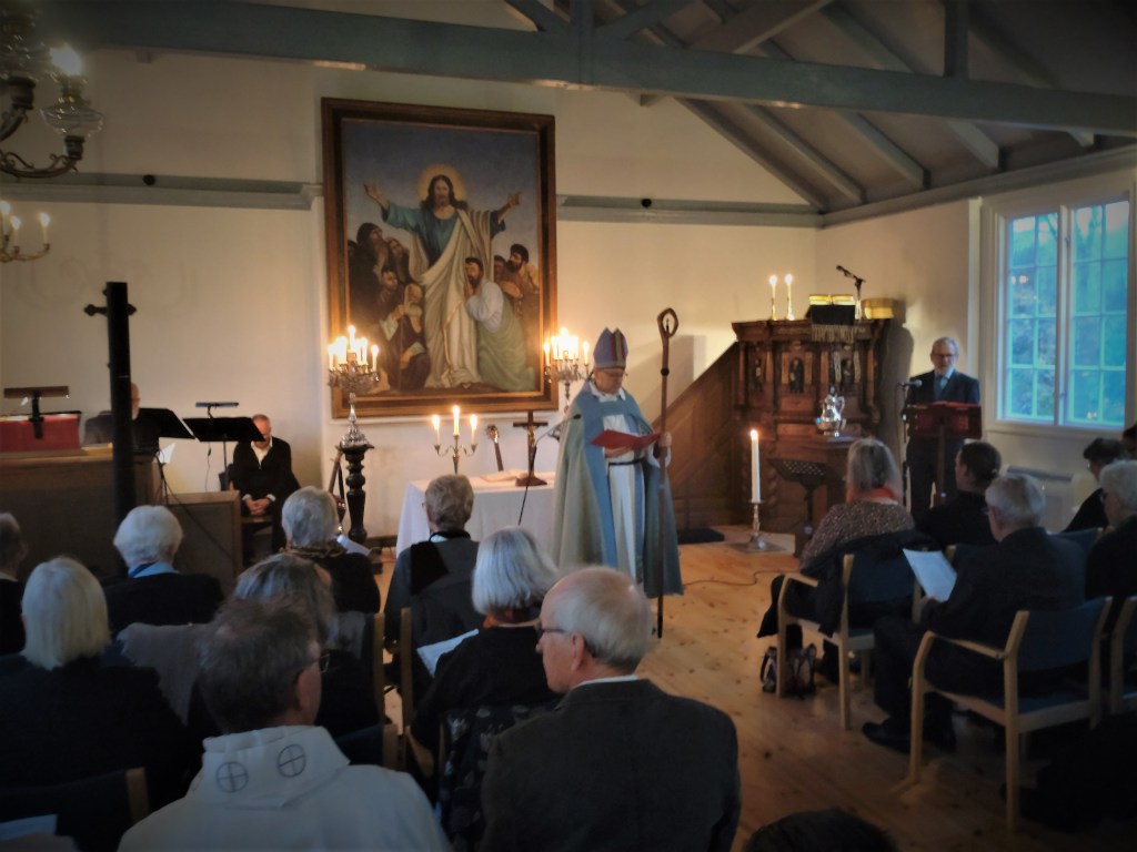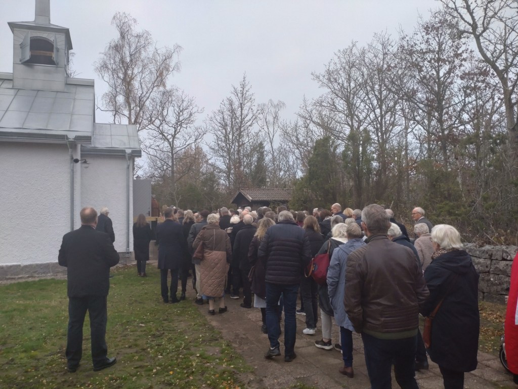 Så var det dags! Biskop Johan Tyrberg på plats utanför kyrkporten för att officiera återinvigningen av Tjurkö kyrka efter den omfattande renoveringen. En stor händelse på ön, givetvis. Många hade samlats för att närvara vid denna historiska begivenhet.Drygt 150 personer köade för att komma in. Festgudstjänst. Även såsom oförbätterlig hedning måste jag medge att det var en stämningsfull upplevelse. Några av oss som var där. Jag och pappa, David Ekelund från mormor Ruths Tjurköklan, samt vännerna Selma Matthiasdottir och Lars Brissmalm från Socialdemokraterna som i kyrkopolitiken varit drivande för att rädda Tjurkö kyrka.