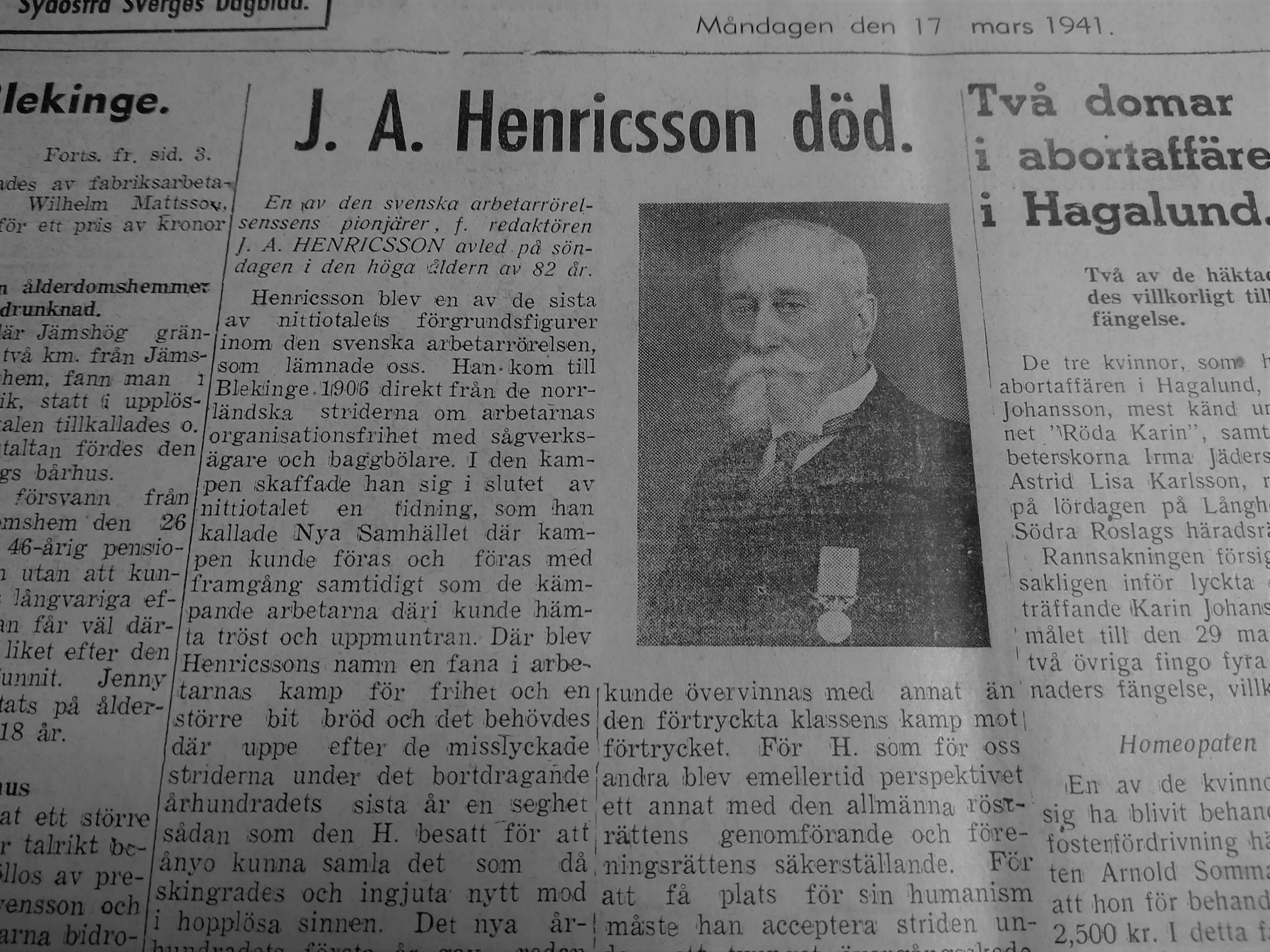 Vår gamle borgmästare J A Henricsson gick ur tiden söndagen den 16 mars 1941, mitt under brinnande andravärldskrig. Sydöstran publicerade nyheten dagen därpå, i en nekrolog signerad tidningens dåvarande redaktör och ansvarige utgivare Algot Törnkvist. Hela texten lyder som följer: