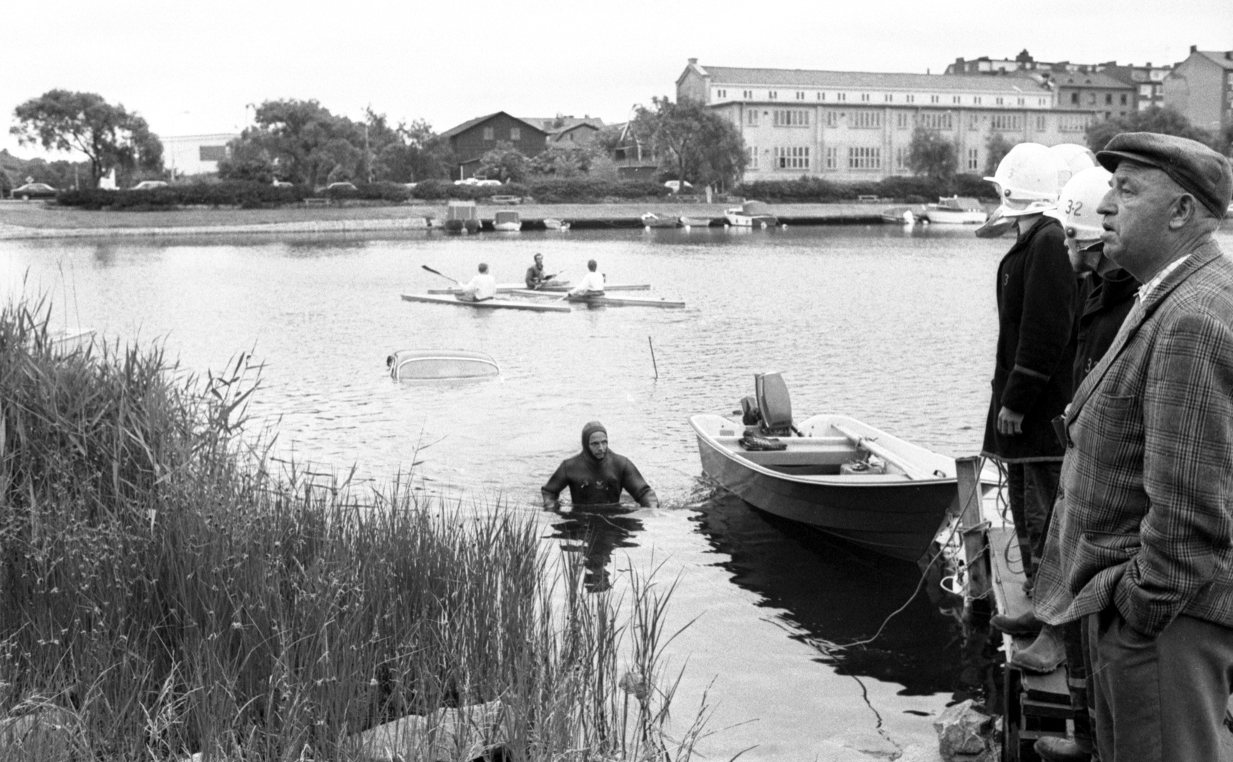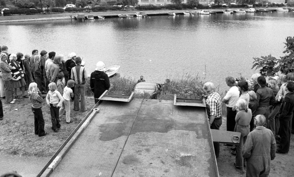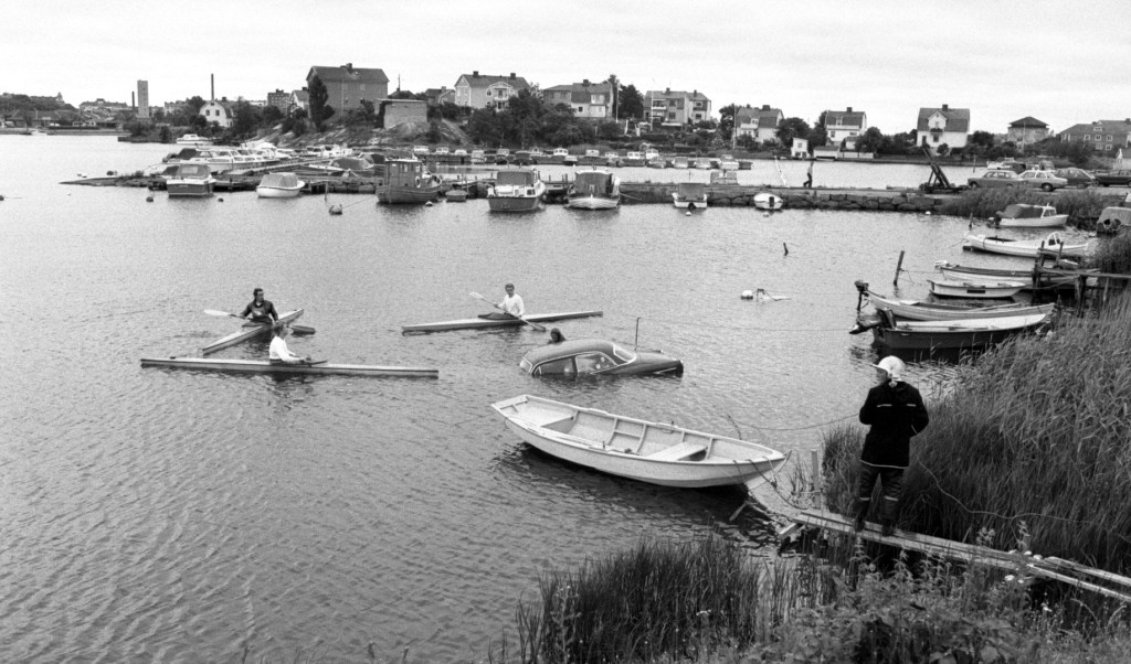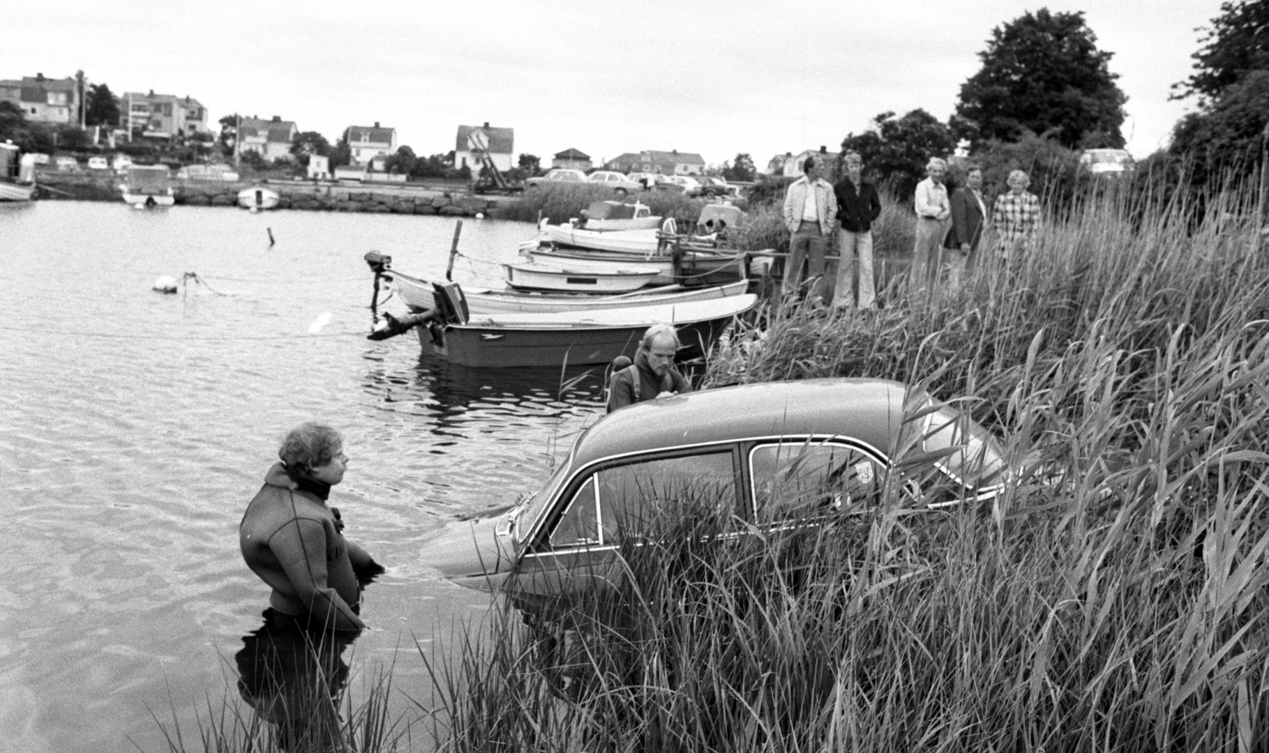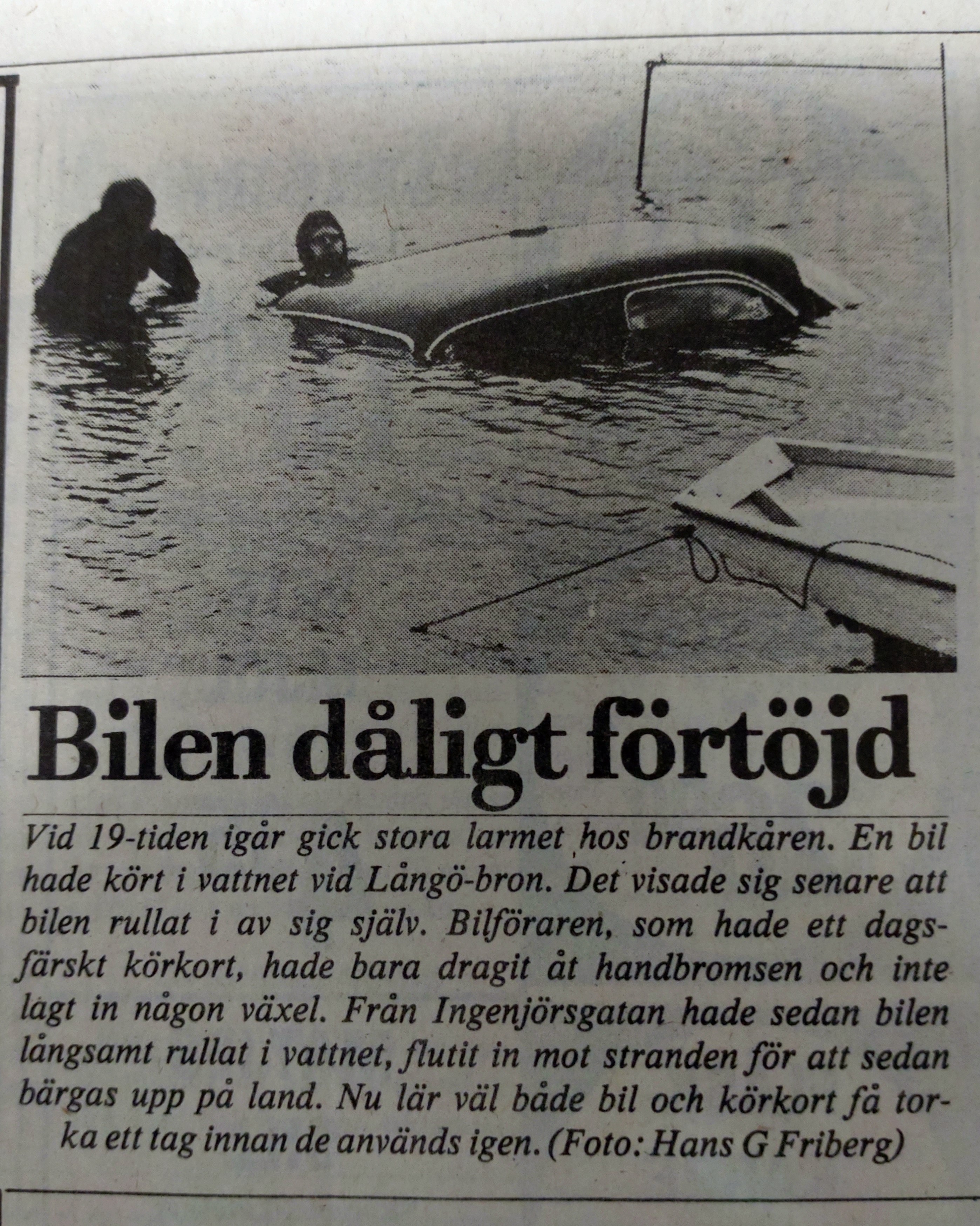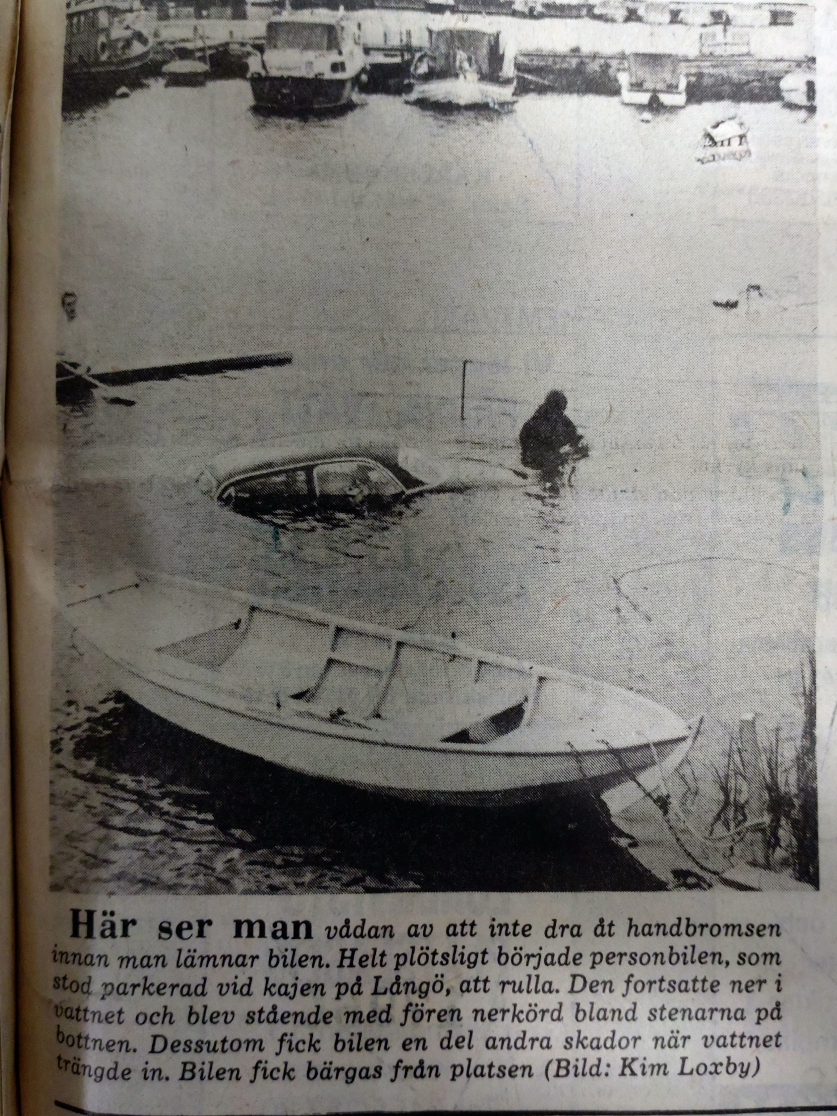 Drama på Långö! Det är onsdag den 22 juni, två dagar före midsommar 1977, och brandkåren har ryckt ut för att bärga en bil som hamnat i vattnet. Uppståndelsen är stor. Det här blir något att snacka om för Långöborna vid nubben och sillen.Bilen är i färd att dras upp. Men hur det gått med föraren?Har det varit en fyllekörning eller vad har hänt egentligen?Följande dag, den 23 juni 1977, kan Sydöstran ge detta besked.Och så här skriver samtidigt BLT. Osis får man väl säga. Fast skönt ändå att det inte var värre. Men observera de motstridiga uppgifterna om handbromsen. Frågan kvarstår alltså: hade novisen vid ratten dragit åt den eller inte?