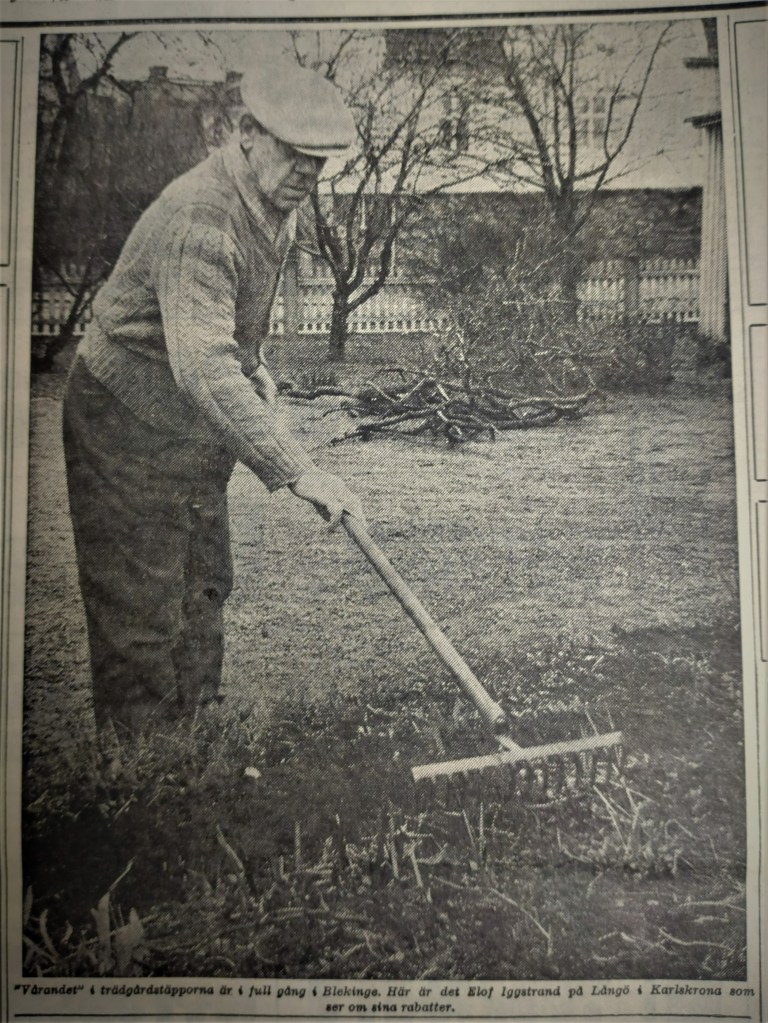 Det är i mitten av april 1967, våren är här och BLT har fångat Långösenioren Elof Iggstrand i trädgårdsarbetet. Bilden är tagen utanför hans bostad på Ingenjörsgatan 3. Innan pensioneringen från yrkeslivet var han verksam som byggmästare.