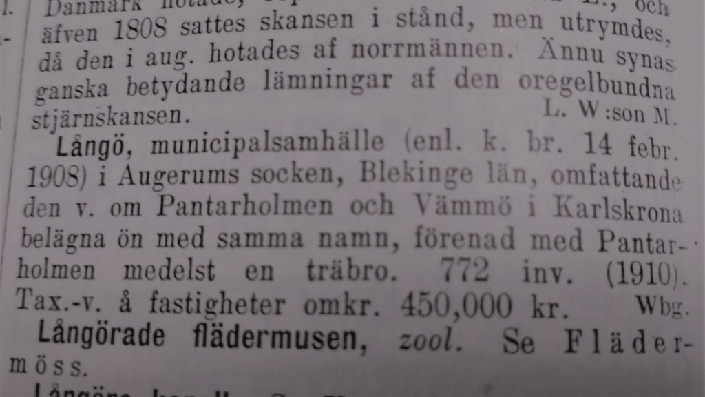 Nordisk Familjeboks berömda Uggleupplaga, utgiven i 38 band åren 1903-26, anses vara den mest kompletta encyklopedi som vårt land producerat i bokform. För att kontrollera om detta påstående möjligen kunde hålla streck, sökte jag naturligtvis efter Långö – och som synes ovan fanns glädjande nog en liten artikel om vår kära hemvist med.