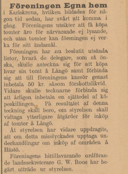 Ur Karlshamns Allehanda den 1 december 1904. Landssekreteraren G W Roos tillhörde det enskilda konsortium som 1899 köpte Långö för 10 000 kronor (cirka 700 000 kronor i dagens penningvärde) för att exploatera marken. Men tydligen har det uppstått något trassel med den lokala egnahemsrörelsen…
