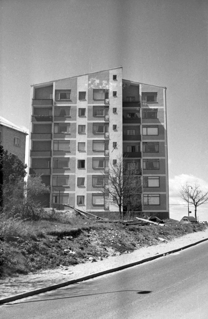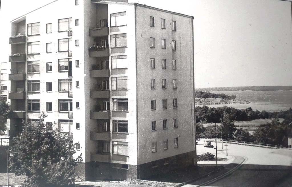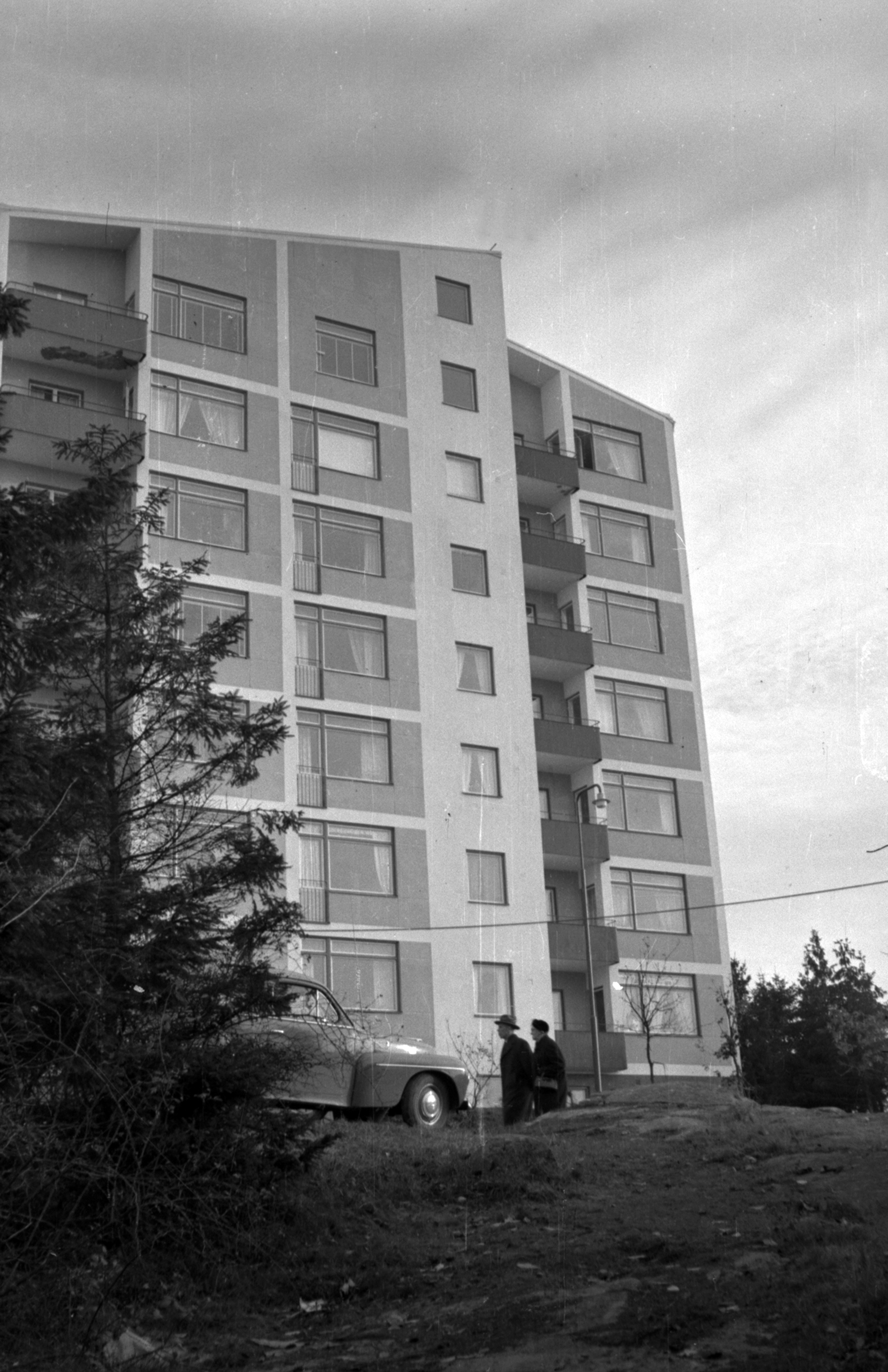 Vi står i backen på Östra Strandgatan och ser baksidan av det nya höghuset med adress Arkitektgatan 8, byggt 1954.Samma hus, samma tidsperiod (1950-tal, möjligen tidigt 1960-tal). Notera att det skymtar en telefonkiosk nere till höger i bild där busshållplatsen finns idag.Men detta av Norra Långös då nyligen uppförda höghus har jag lite svårt att identifiera. En kvalificerad gissning, baserad på vinkel och omgivning, är att den parkerade Volvon PV:n och det strävsamma gamla promenerande paret befinner sig utanför Lagmansgatan 24. Håller ni emot?