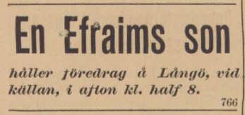 Annons i Blekinge Folkblad den 31 juli 1906. Sannolikt handlar det om en företrädare från den något aparta kristna väckelserörelsen Efraims budbärare som ska försöka frälsa Långöborna. Efraims budbärare grundades 1870 av svenskamerikanen Charles Lee (Carl August Lindqvist, 1840-1926) med budskapet att svenska folket var ättlingar till en av Israels försvunna stammar, Efraims i Gamla testamentet. Därför skulle vi få en särskilt gynnad ställning i det kommande tusenårsriket.