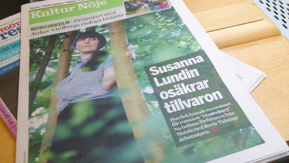 I somras gav hon ut sin första bok som möttes av lysande recensioner. I torsdags belönades hon med Borås Tidnings prestigefyllda debutantpris. En ny stjärna från Motala är född: Susanna Lundin, författare till den prisade romanen Hindenburg. (Intervju i Corren 23/2):