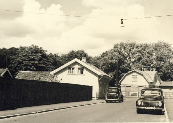 Vi stannar i krokarna och är nu på Östergatan 1957. Huset i Badhusparken på andra sidan viaduktens räcken fanns fortfarande kvar när jag var liten på 70-talet, men då spöklikt övergivet och revs senare. Läget var udda och precis intill järnvägsspåren. Länge undrade jag vilken mystisk person som kunde bott där tidigare. Den mindre fantasieggande sanningen om fastigheten, byggd kring sekelskiftet, är att huset ursprungligen rymde ett acetylengasverk. Verksamheterna kom därefter att skifta: köttbesiktningsbyrå, elverkskontor, drätselkontor och som final: lokal för hembygdsföreningen 1965-1972.