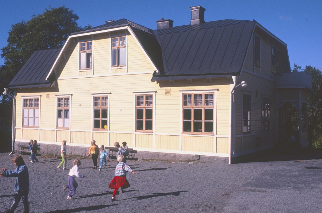 Långöskolan, ännu full av stojande elever, 1989. Det stora skolhuset vi ser på bilden uppfördes 1909 och var då alltså prick 80 år gammalt. Detta foto, taget på skolgården mot Lagmansgatan, är från samma tillfälle 1989. Tyvärr sjöng verksamheten på sista versen. Året därpå lades den idylliska Långöskolan ner och bytte skepnad till bostadshus. Observera ovan trädet skyltarna för ett övergångsställe på Lagmansgatan, även det är borta numera.